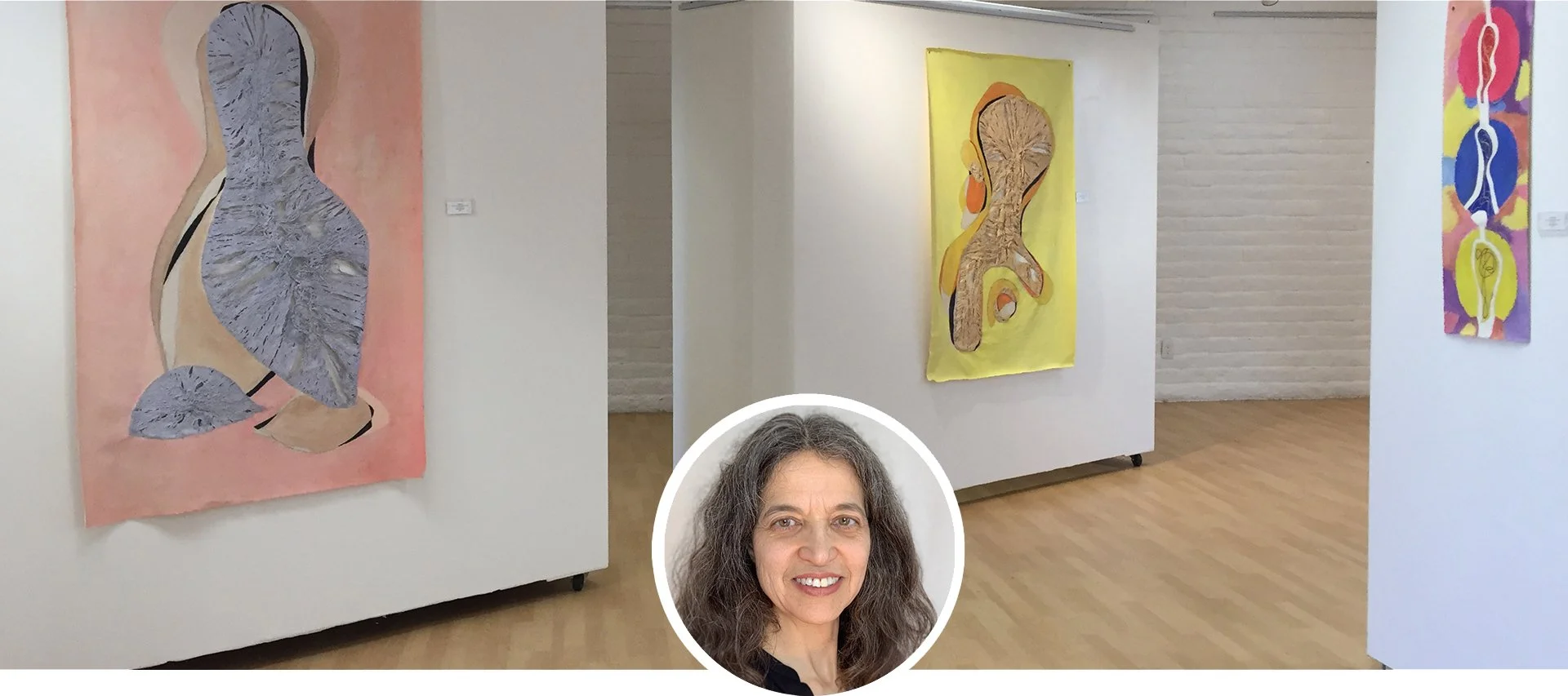 Maria makes paintings out of manipulated cotton duck, by cutting and unraveling the threads that hold the canvas together and then re-assembles the material into biomorphic shapes that are painted with oil and/or acrylic.